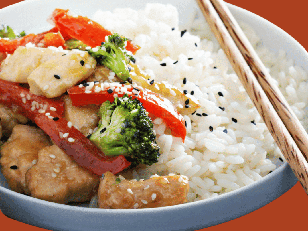 Tender teriyaki chicken served with steamed rice and a medley of vibrant stir-fried vegetables