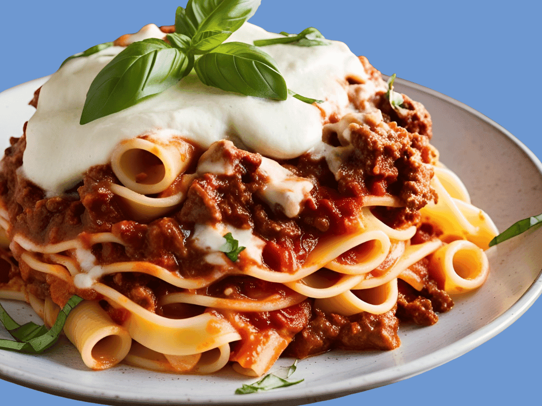 A comforting pastitsio bake with layers of pasta, rich bolognese sauce, and creamy béchamel, baked to perfection for a hearty, flavorful meal.