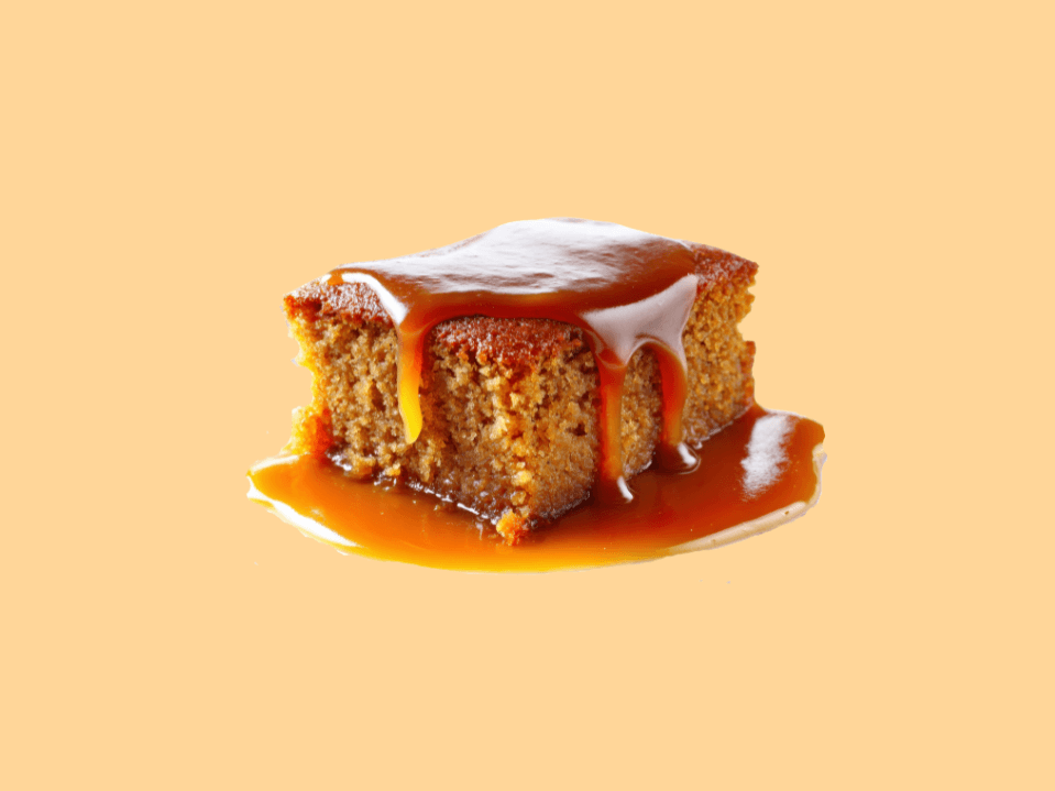 Warm butterscotch self saucing pudding with a soft sponge top and rich sauce beneath.