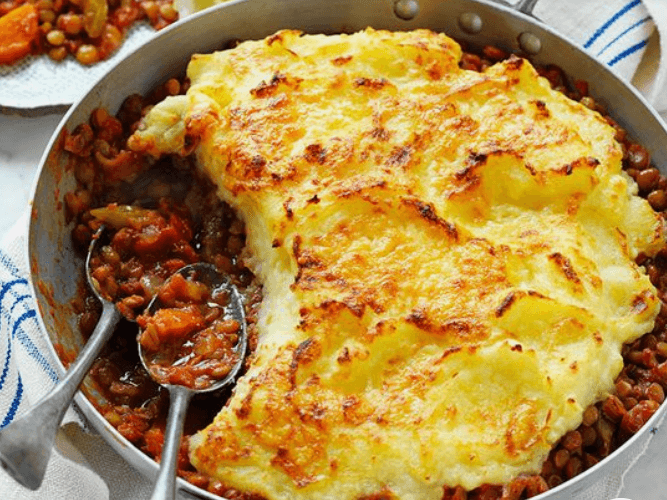 This vegetarian cottage pie is made with a lentil and veggie base, (onion carrots celery leek and peas) and packed full of flavour. Finished with CotC's buttery mashed potatoes. A great one for meat free Mondays or a great filling and cost effective dinner.