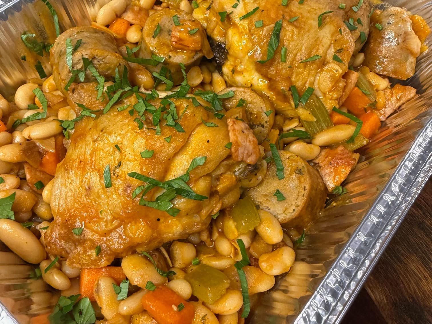 This is the COTC version of the French classic. We start with succulent bone-in, skin-on chicken thighs, which we brine to ensure maximum tenderness and moisture. After sealing them off to lock in the flavor, we braise them slowly with savory pork sausages, salty bacon, and creamy cannellini beans. The base is built on a traditional foundation of sautéed onion, garlic, carrots, and celery, simmered in a rich chicken stock and a touch of tomato paste with our house-blend herbs. It all comes together into a hearty, warming version of the French classic that’s perfect for a Melbourne autumn night.