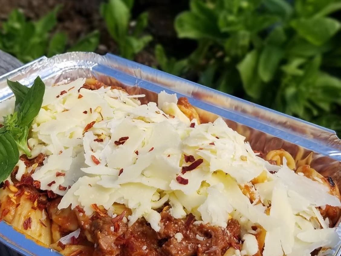 Slow cooked Beef Brisket Ragu with Penne and Parmesan. This pasta dish is packed with flavour, the beef brisket has been slow cooked for 18 hours and the ragu sauce is blended and mixed through the pasta. It is finished with shaved parmesan.