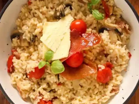 A luscious risotto with prosciutto, basil, tomatoes finished with bocconcini & parmesan cheese. As always ~ Gluten Free