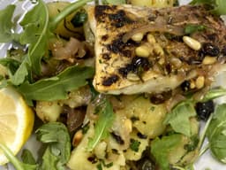 Potato, Shallots, Pine nuts, Raisins, Oregano, Fresh thyme, Parsley, Wine vinegar, Capers, Salt, Butter (Milk), Olive oil