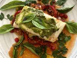 Snapper (Fish), Cherry tomatoes, Pesto (Milk, Pine nut), Leek, Basil, Mixed herbs