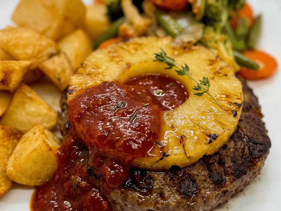 Succulent meat patties, pork sausages, complemented by roast potatoes, sweet pineapple rings, and stir-fried vegetables drizzled with zesty sauce.