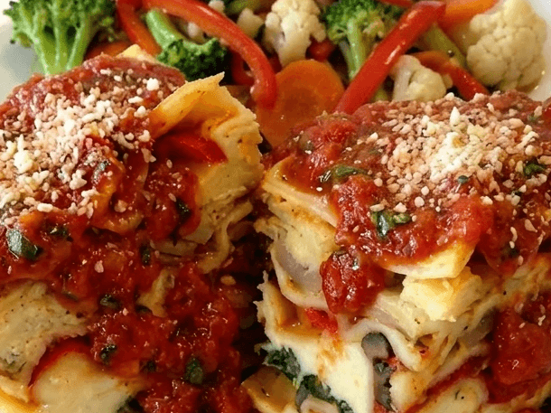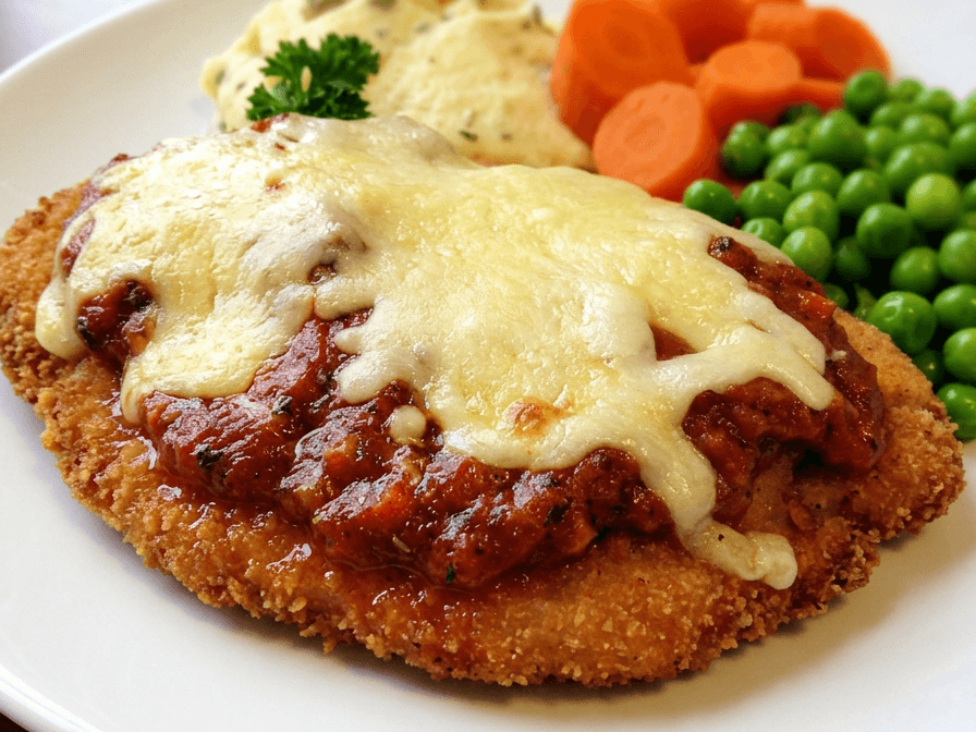 Tender chicken is breaded to perfection, smothered in napoli sauce, and topped with melted cheese and served with a side of vegetables.