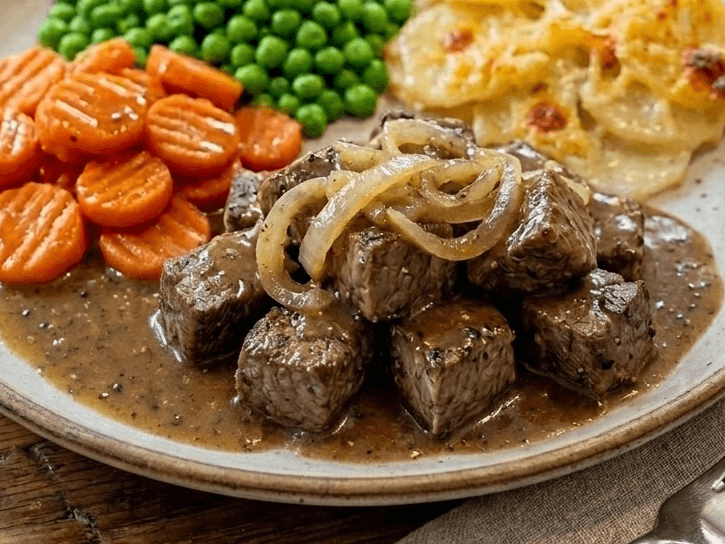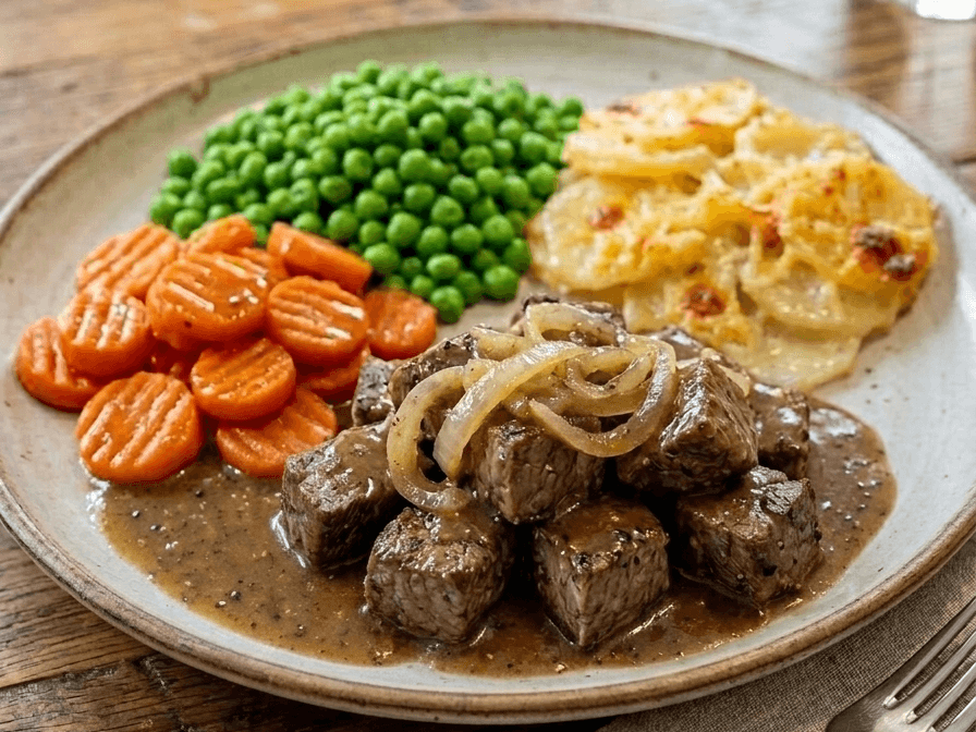 Tender braised steak with savoury onions, served alongside creamy mashed potatoes and vegetables.