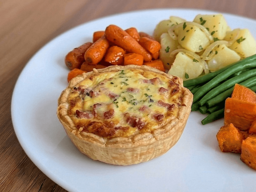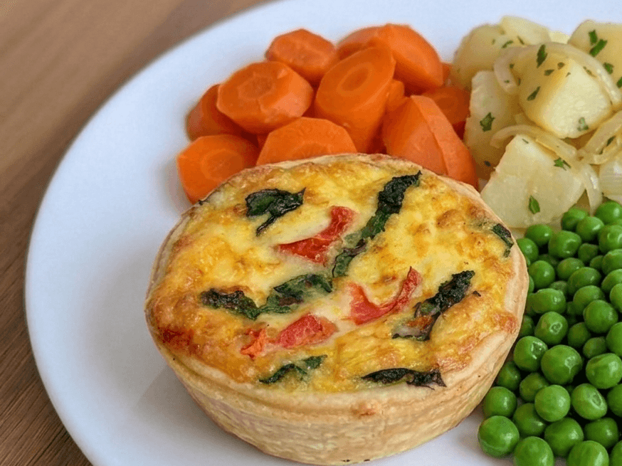 Savoury spinach and tomato quiche served with sweet potatoes, vibrant peas, and honey-glazed carrots.