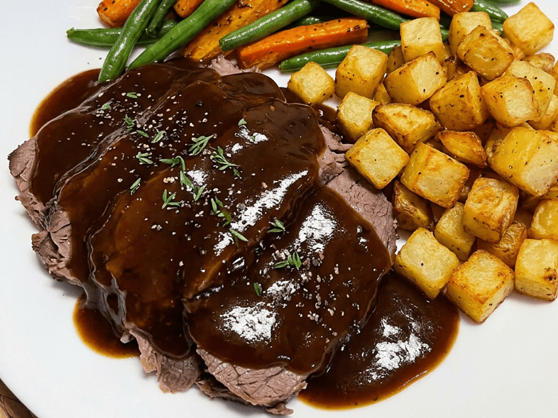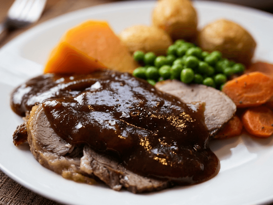 Roast beef, cooked together with chef choice herbs topped with gravy, served alongside with roast potatoes and greens. Brings back the old farm memories.