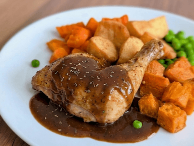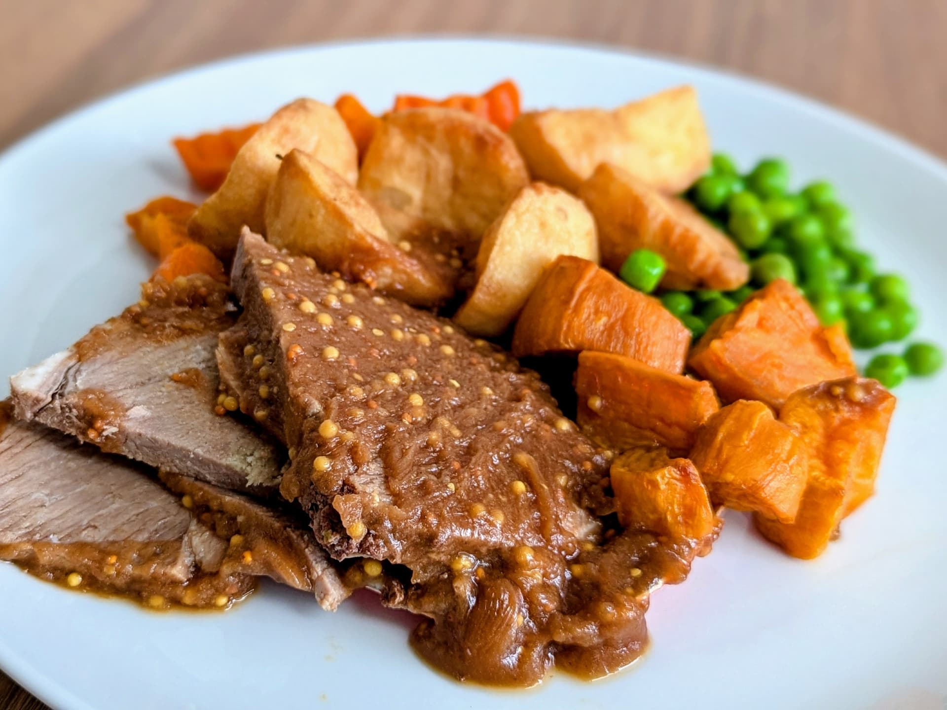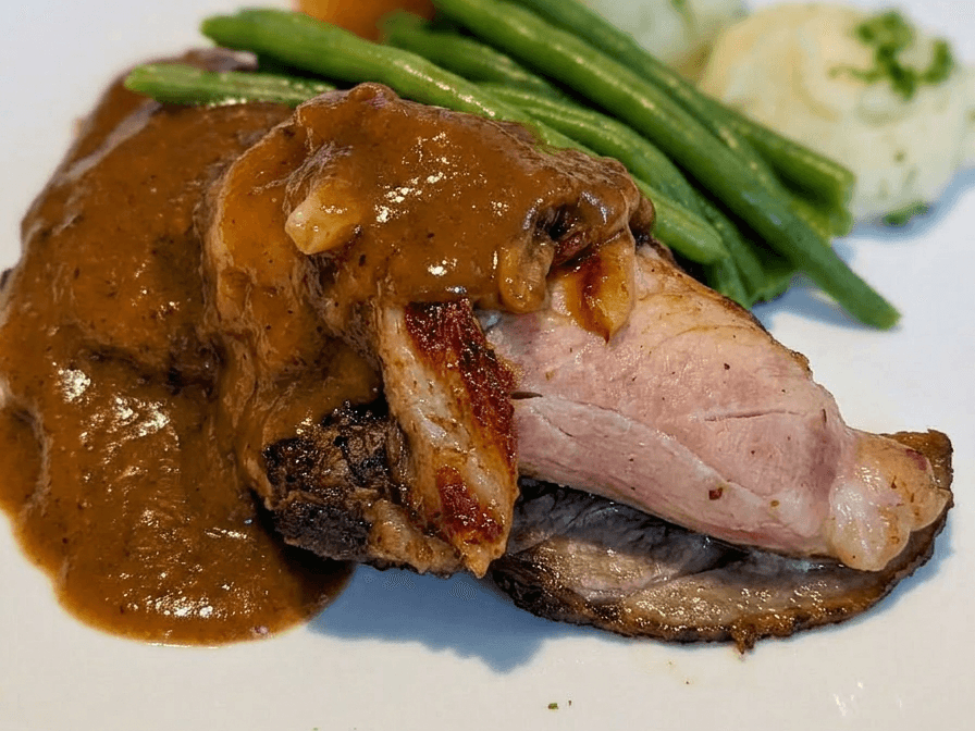 A succulent lamb dish infused with Bavarian mustard and served with roast potatoes, sweet potatoes, and peas. All drizzled with brown gravy.