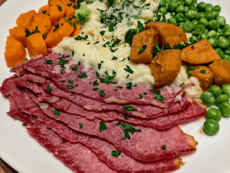 Corned Silverside paired with vibrant veggies, creamy mash, and a zesty white horseradish sauce.