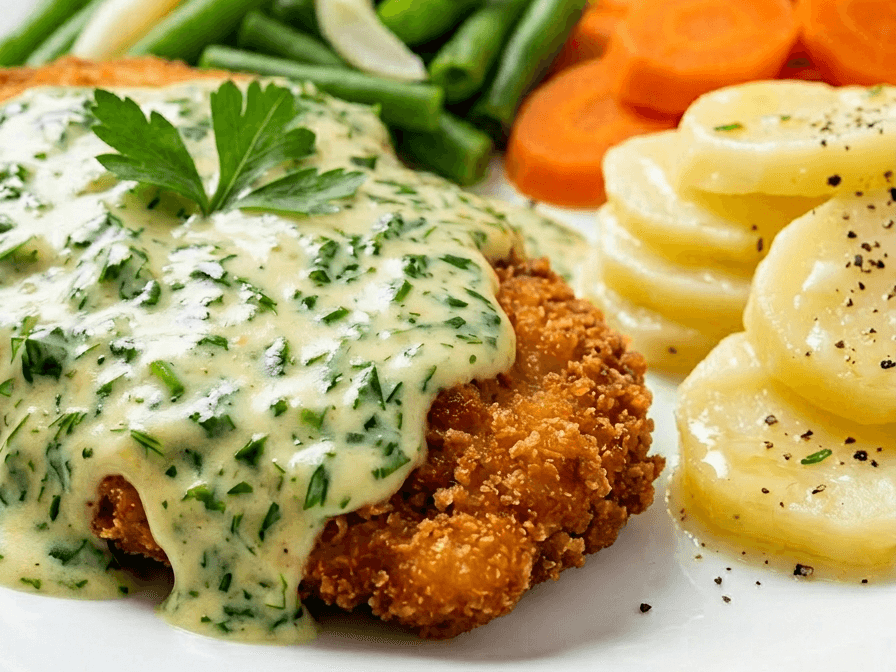 A fusion of chicken schnitzel, vibrant spinach, and creamy white sauce, paired with honey-glazed carrots and sweet potato.