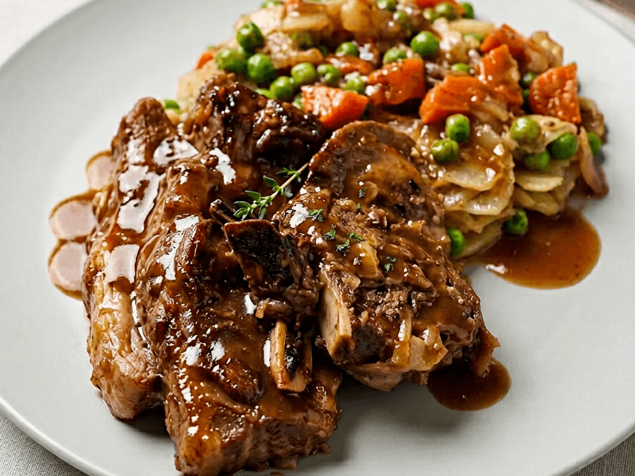 Slow-cooked braised lamb chops, complemented by buttery lyonnaise, vibrant carrots, and peas, served with brown gravy infused with Worcestershire sauce.