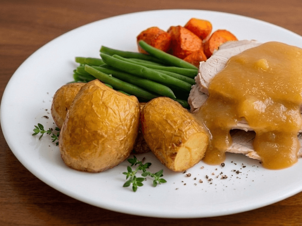 Roast Pork with Apple Sauce, featuring a pork leg roast smothered in savoury gravy, paired with sweet diced apples, roasted potatoes and vegetables.