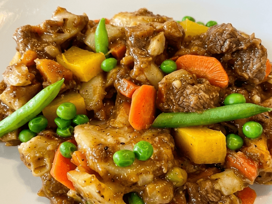 Tender chuck steak accompanied by a medley of pumpkin and mixed vegetables, all enveloped in a savoury, herb-infused gravy.