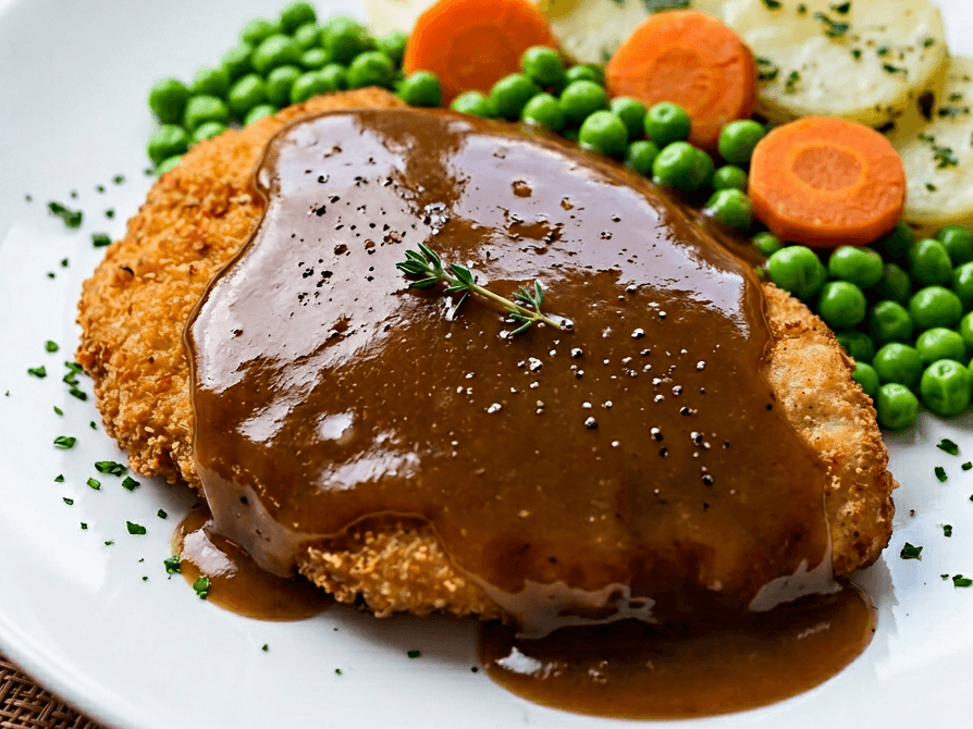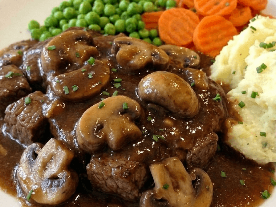 Tender braised steak smothered in mushroom sauce, paired with creamy mashed potatoes and vibrant seasonal vegetables.