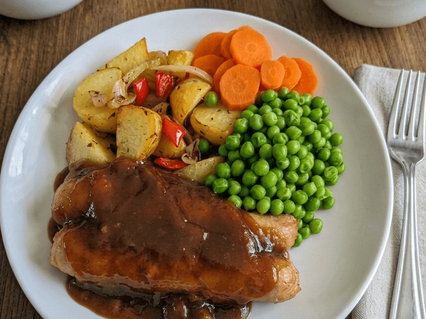 Grilled sausages served with a brown gravy, accompanied by sweet honey carrots, creamy mashed potatoes, sweet potatoes, and peas.