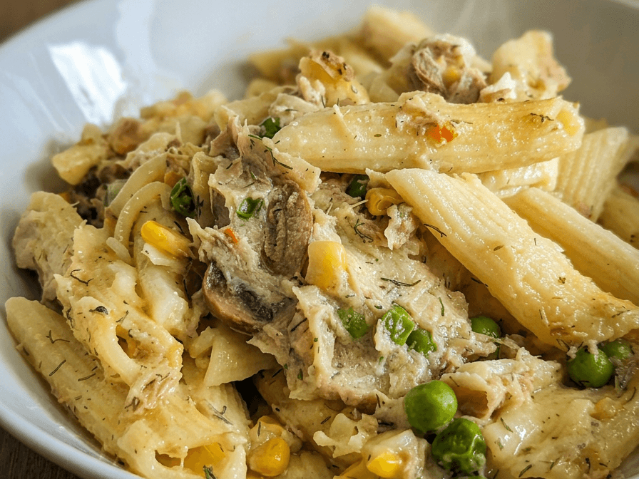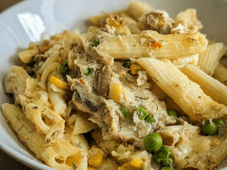 A blend of tuna, mushrooms, peas corn and cheese, all nestled in creamy pasta.