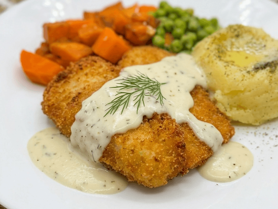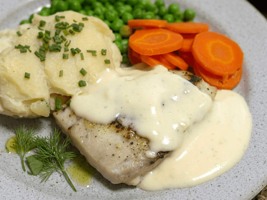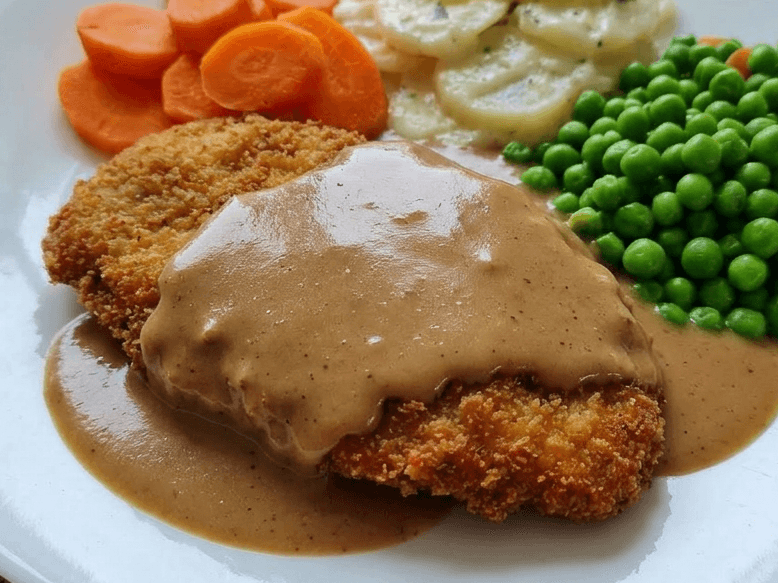 Schnitzel drizzled with a pepper sauce, served alongside creamy potato, sweet potato, honey-glazed carrots, and peas.