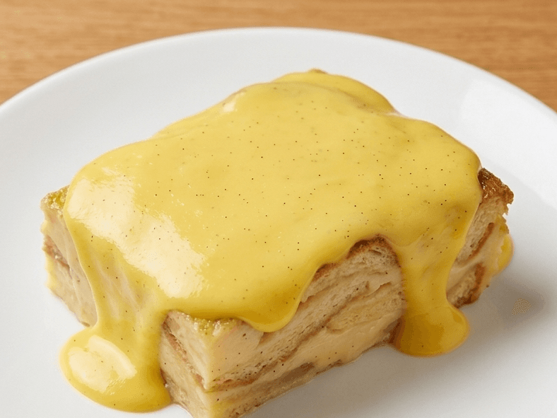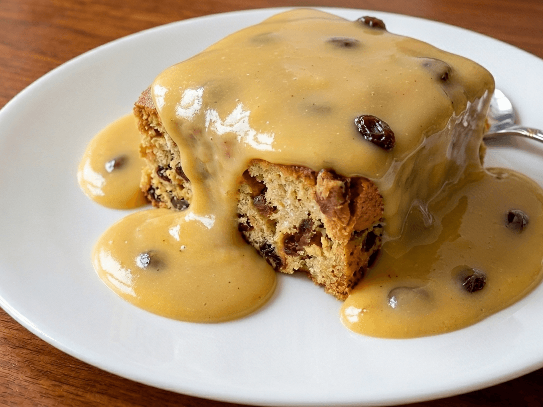Classic bread and butter pudding with soft layers of bread baked in creamy custard.