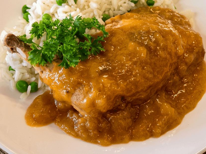 Tender chicken thighs glazed in apricot sauce, served with fluffy white rice and peas.