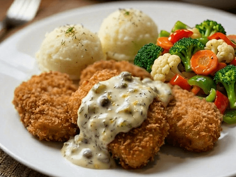 Chicken Schnitzel, and served alongside a medley of creamy potatoes, sweet potatoes, and greens.