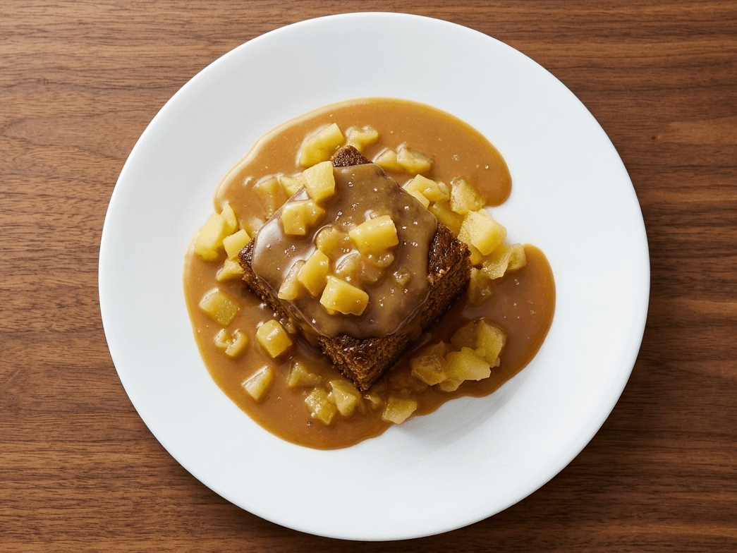 Luscious butterscotch sauce drizzled over diced apples and caramel mud cake.