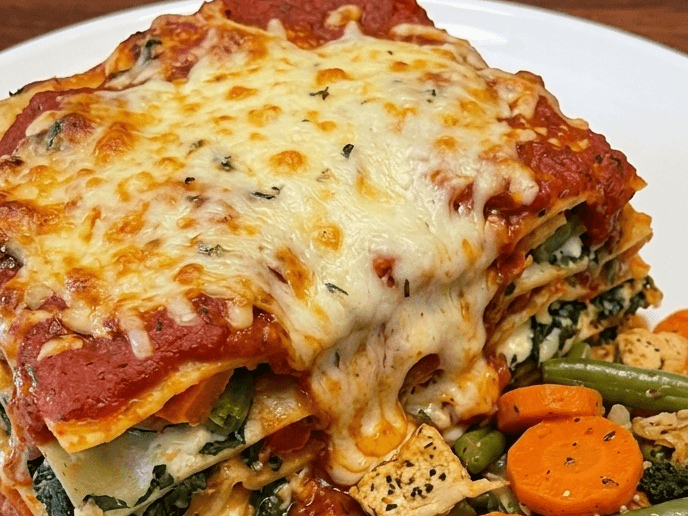 Vegetable Lasagna layered with white sauce, complemented by buttery stir-fried vegetables.