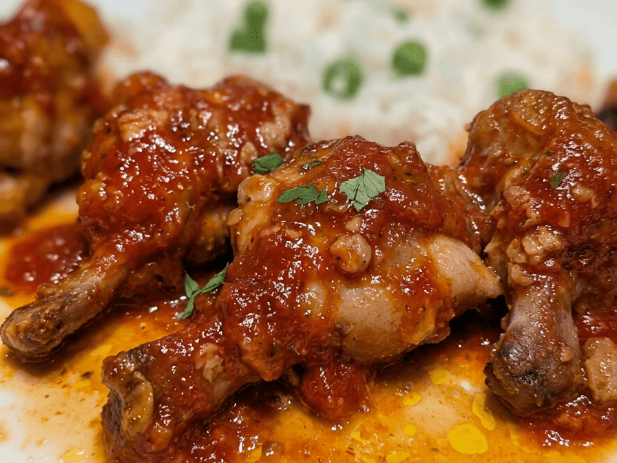 Tender chicken wings glazed in a bourbon sauce, served alongside fluffy rice and peas.