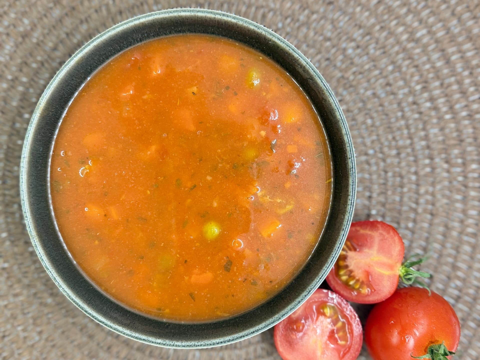 A hearty tomato soup made with a blend of vegetables and finished with cream.