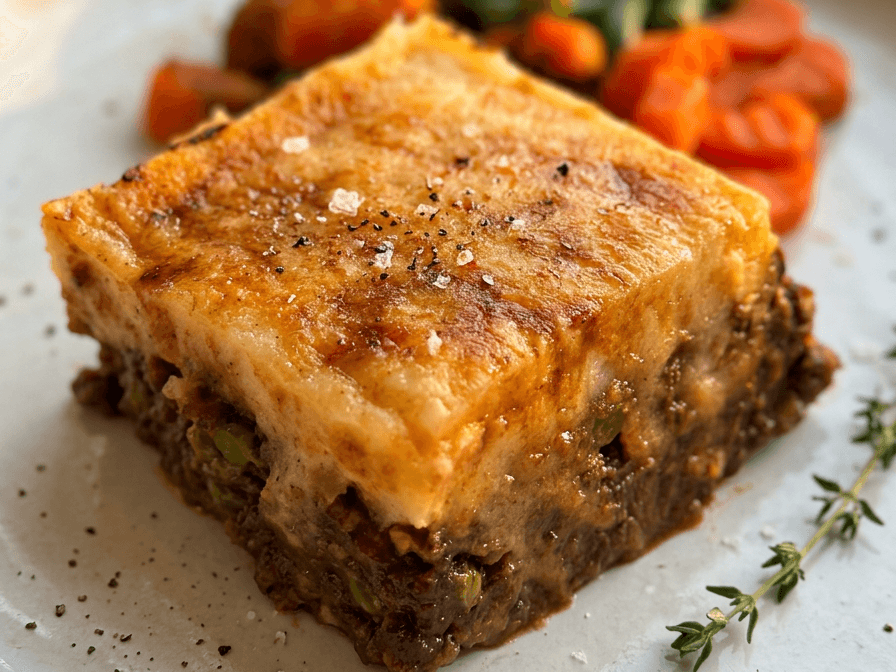 Layers of savoury beef lasagna, baked and paired with vibrant buttered stir-fried vegetables.