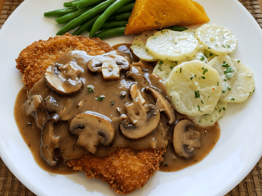 Schnitzel smothered in a creamy mushroom sauce, served with a medley of veg.