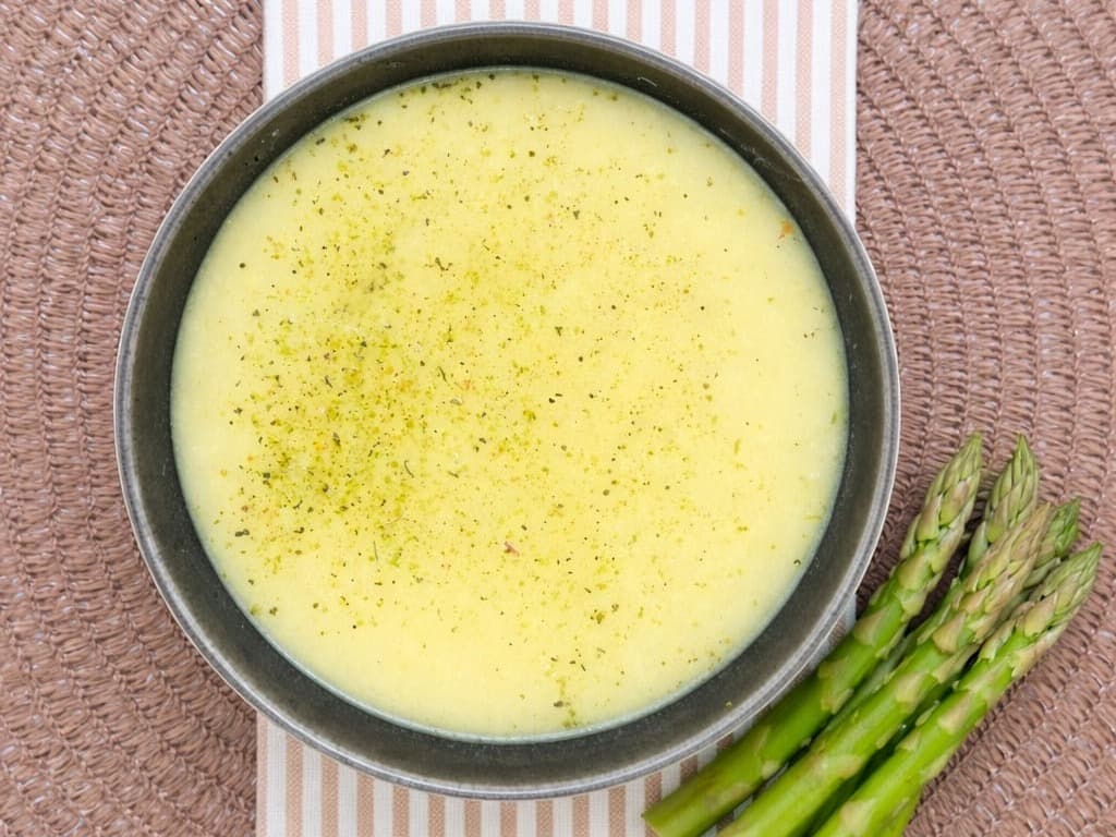 Fresh asparagus, potato, and onion, gently simmered and finished with cream.