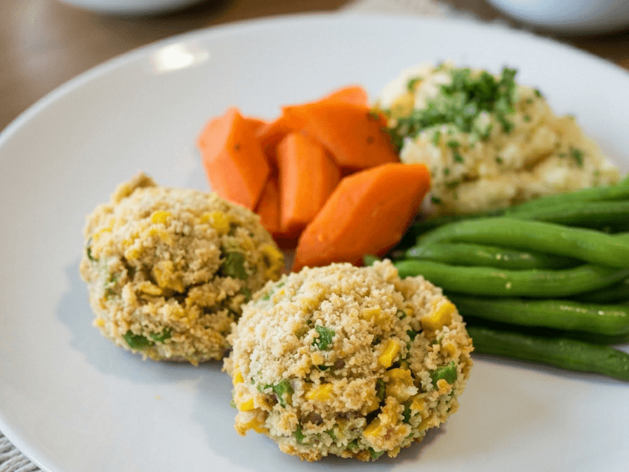 Vege patties paired with creamy homemade mashed potatoes generously topped with melted cheese, complemented by a vegetable medley.