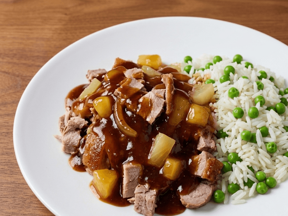 Tender BBQ pork paired with fluffy rice, peas, and sweet pineapple.