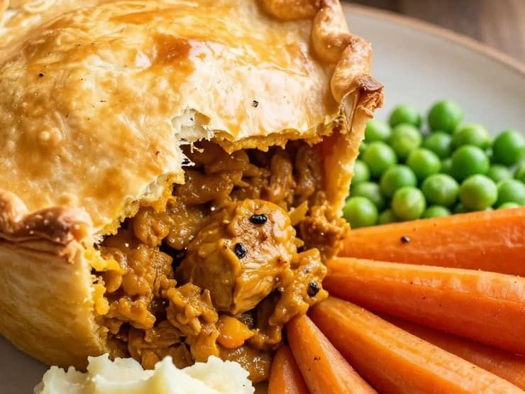 A fusion of flavours with our Creamy Coconut Chicken Pie, complemented by velvety mashed potatoes, sweet potatoes, carrots, and peas.