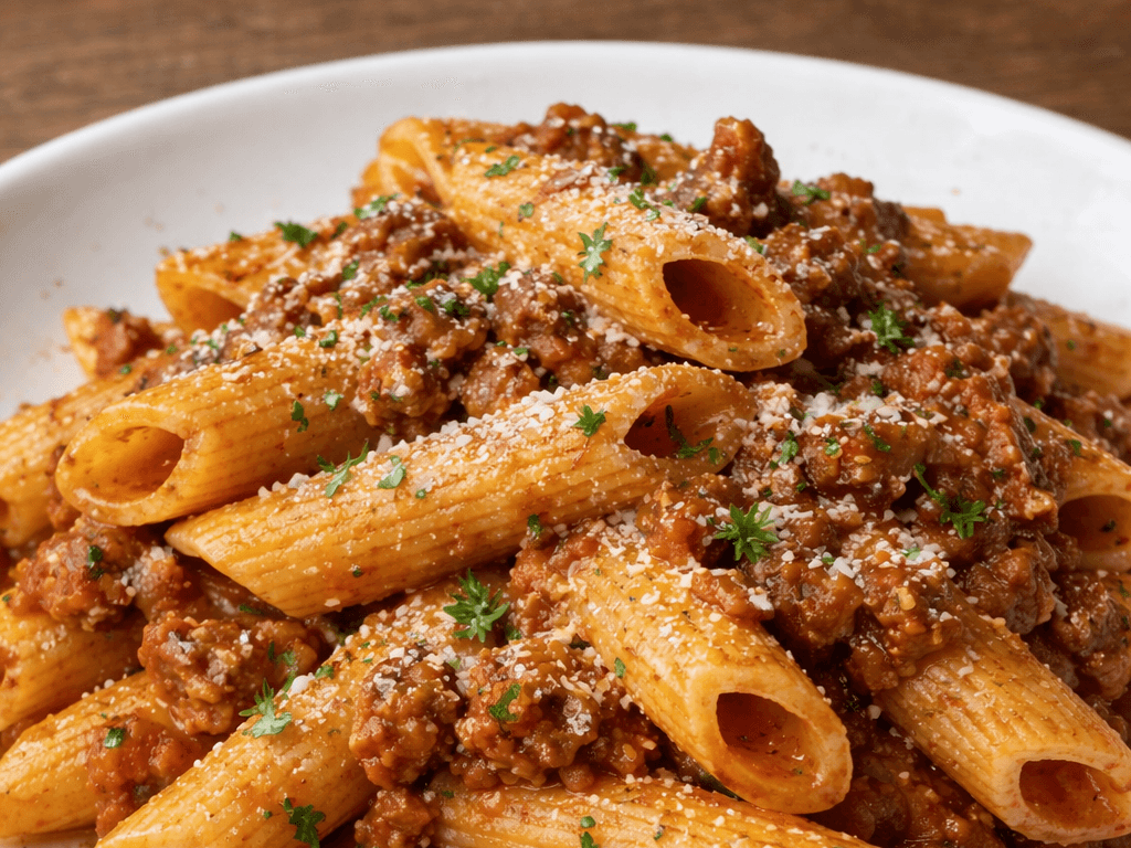 Classic penne bolognaise with savoury beef mince, tomato and aromatic herbs, topped with melted cheese.