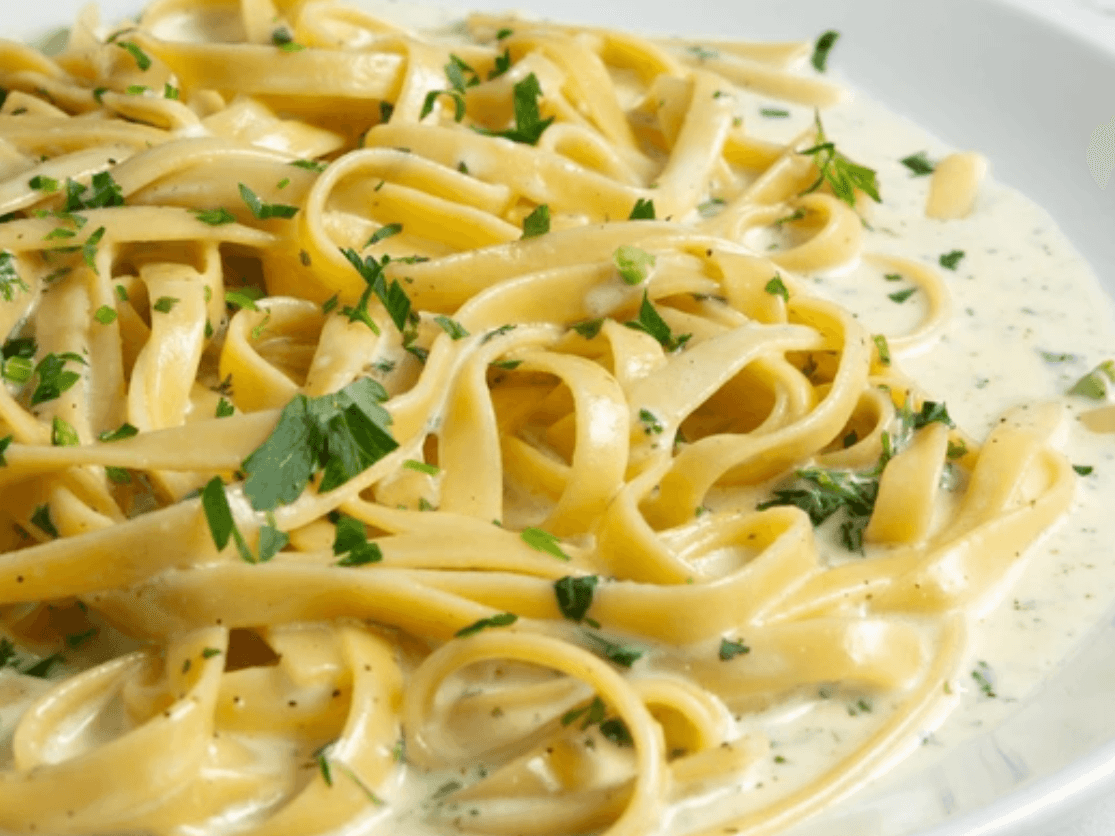 A blend of gluten-free bacon pieces, sautéed onions, and mushrooms, complemented by a splash of dry white wine and Parmesan cheese, all combined in velvety cream over pasta.
