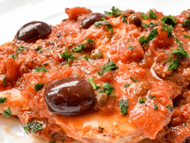 Locally caught stargazer, also known as monkfish cooked in a slowly cooked ragu, with olives, capers and all the Sicilian flavours!