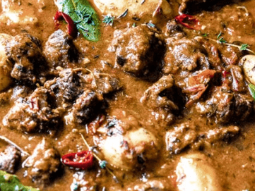 Goat meat marinated in traditional aromatics, dry spices and herbs, and fried in curry then slow cooked until it is tender. Capsicum and diced potatoes are added near the end of cooking to thicken the curry and add some extra starch to soak up all the goodness of the slow cooked meat and veggies...delicious!