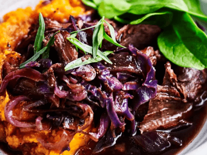 Spiced and fragrant slow cooked mulled wine pork and red cabbage is a beautiful combination - complimented well with sweet potato mash for a flavoursome meal.