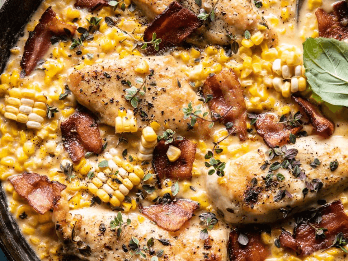 Garlic Butter!! Creamy Corn Chicken! Is there anything better? This chicken is beyond delicious. It’s creamy, garlicky, packed with corn, and finished with fresh herbs and parmesan. Perfect cozy, dinner for any night of the week.