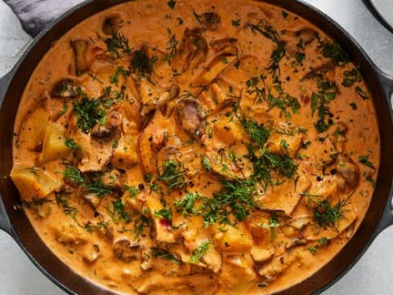 Why should the carnivores have all the fun?!! This is a vegetarian adaptation of chicken paprikash, a classic dish in Hungary. Delicious with mashed potato or steaming hot rice.
