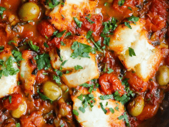 A traditional Greek dish with fish cooked in a rich tomato sauce with Ouzo, fresh herbs and dotted with feta cheese...close your eyes and pretend you're on a Greek Island....