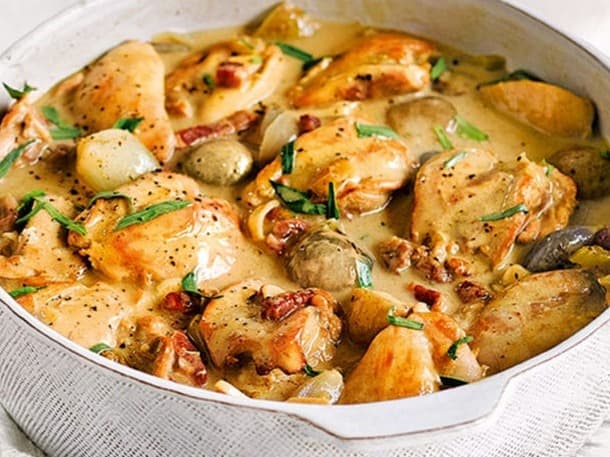 Chicken thigh cutlets and drumsticks braised with double smoked bacon, garlic, mushrooms, tarragon, mustard and a dash of cream!