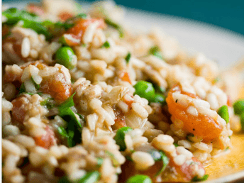 A light, Spring time risotto with grilled chicken, semi dried tomatoes, asparagus and spinach - finished with parmesan and fresh herbs.