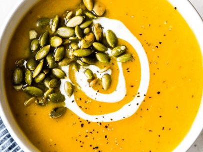 Pumpkin, garlic sage and a dash of cream..topped with toasted tamari pepitas (pumpkin seeds) - perfect for cold rainy days.