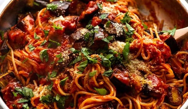 Traditional pasta with roast eggplant, a ton of fresh herbs and dollops of ricotta - an excellent, meaty-like but vegetarian main dish that’s everything you want in a pasta – comforting, satisfying, and slurp-worthy good!