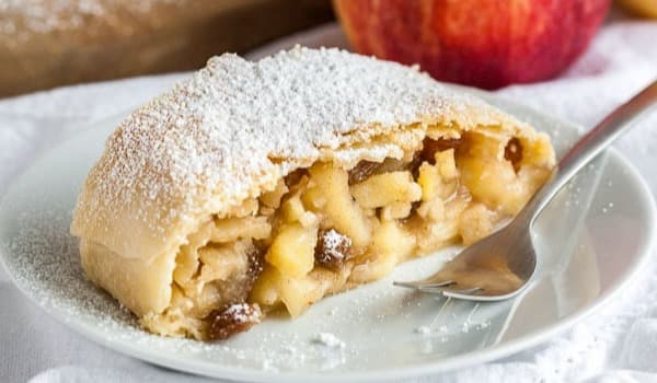Classic Austrian Apple and Raisin Strudel with flakey filo pastry.